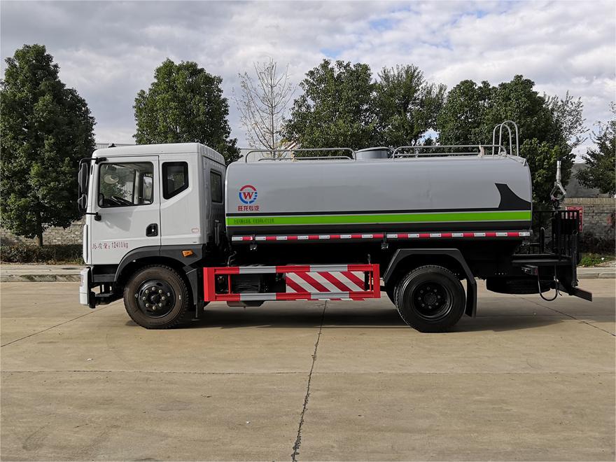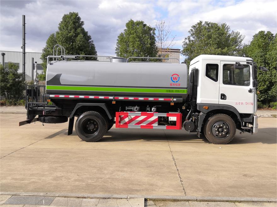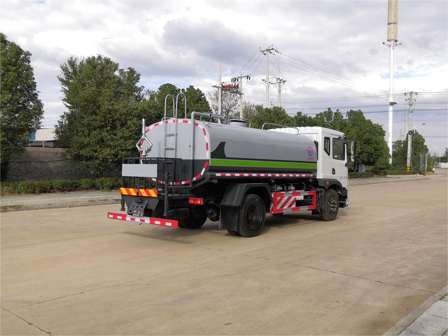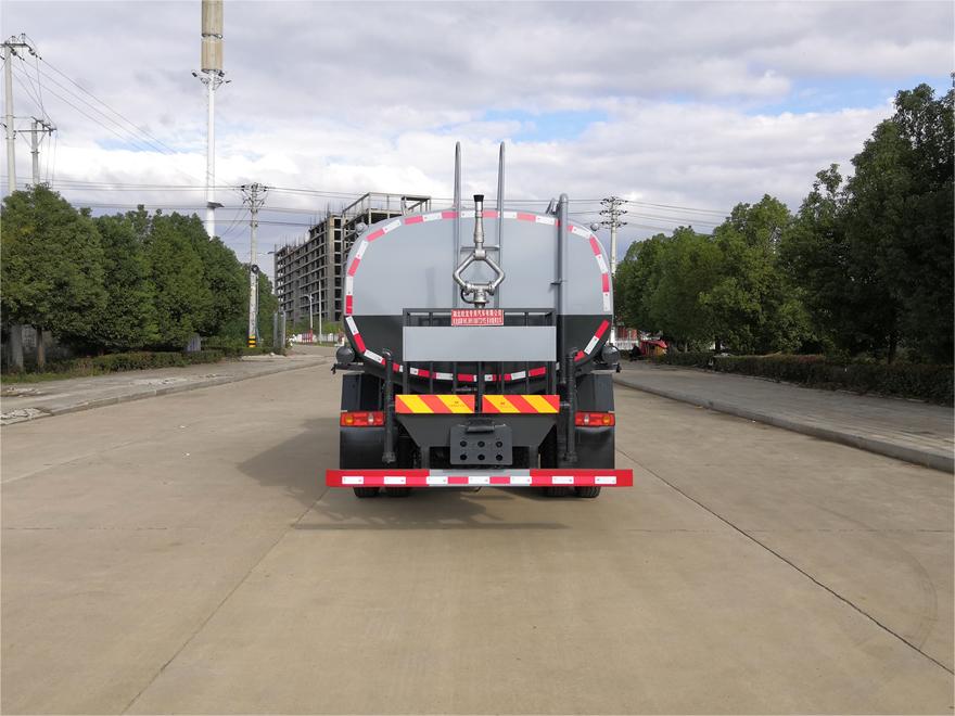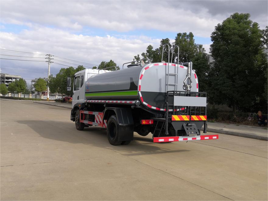 灑水車前裝有鴨形噴嘴或圓頭沖嘴,后面裝有圓柱開灑水噴嘴或蓮蓬頭噴嘴,后部有一工作平臺(tái),裝配有水炮。后部還可裝8個(gè)噴嘴(選裝)。