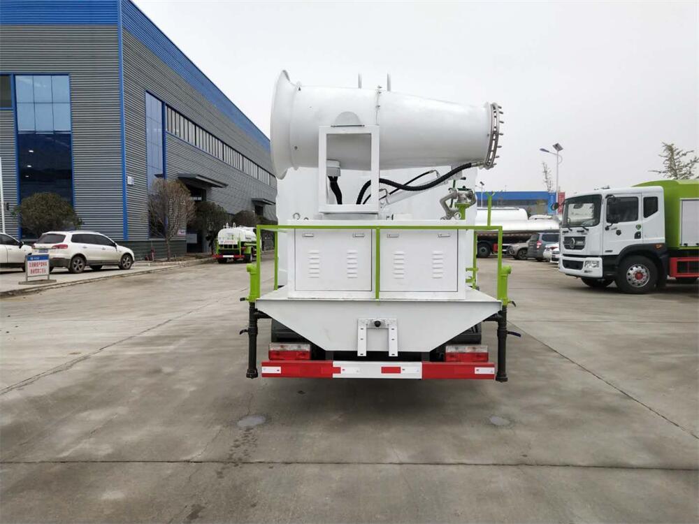 上裝配置:罐體容積為 8立方,選配風送式霧炮機組射程30米、40米、50米、60米、80米、100米、120米霧炮,罐體鋼板為4mm碳鋼Q235材質(zhì),罐內(nèi)隔板具有防波作用,以減輕汽車行駛時罐體液體沖擊,罐體及整車外形尺寸按照公告。帶大功率專用灑水泵,泵可自吸自排,整車前沖、后灑、側(cè)噴、帶65消防接口,后平臺配CLW-50、CLW-60、CLW-80、CLW-100、CLW-120型風送式霧炮機組;罐體前封頭配大功率柴油發(fā)電機組;前封頭帶水位計,后平臺主管路帶1寸澆花接口,后爬梯。帶兩根輸水管及陰陽端。罐體顏色:銀/灰/綠,罐體兩側(cè)噴“多功能抑塵車”字樣,貼反光標示。