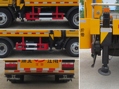 后伸:600mm;隨底盤選裝駕駛室;吊鉤為選裝件;側面防護及后下部防護裝置材料材質:Q235,連接方式:焊接加螺栓連接;后下部防護裝置斷面尺寸(寬贅?:30?00(mm),離地高度:380mm;ABS廠家及型號:襄陽東風隆誠機械有限責任公司/ABS/ASR-24V-4S/4M;主要專用裝置為折疊臂,用于搶修電力、通訊、路燈等高空作業. |