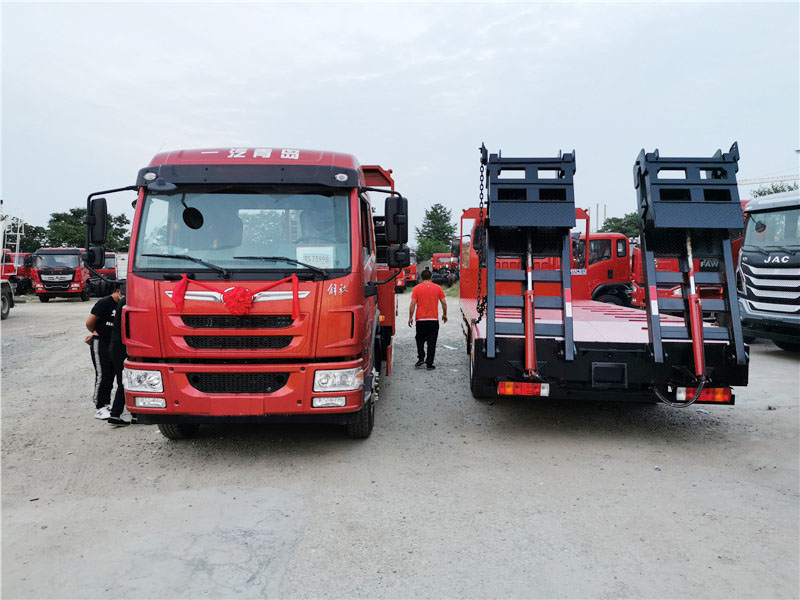 解放龍V單橋平板運輸車 一汽青島駕駛室 排放:國五新規 發動機:錫柴180馬力 變速箱:陜齒8檔 前后橋:145后橋 可選軸距:5米軸距 輪胎:900-20鋼絲胎 大梁: 250雙大梁 整車對應尺寸:9000*2500*2900 車型亮點:ABS防抱死系統 . 剎車間隙自動調整臂、防飛濺、中控鎖,遙控鑰匙,電動門窗,鋁合金油箱。 上裝采用五毫米花紋鋼板,100*100方鋼做橫梁,加強雙簧爬梯,可拉15噸以下挖機。 可選裝配置:液壓全自動爬梯,折疊型加長型液壓全自動爬梯,可加裝兩邊伸展,一邊可伸縮30公分。