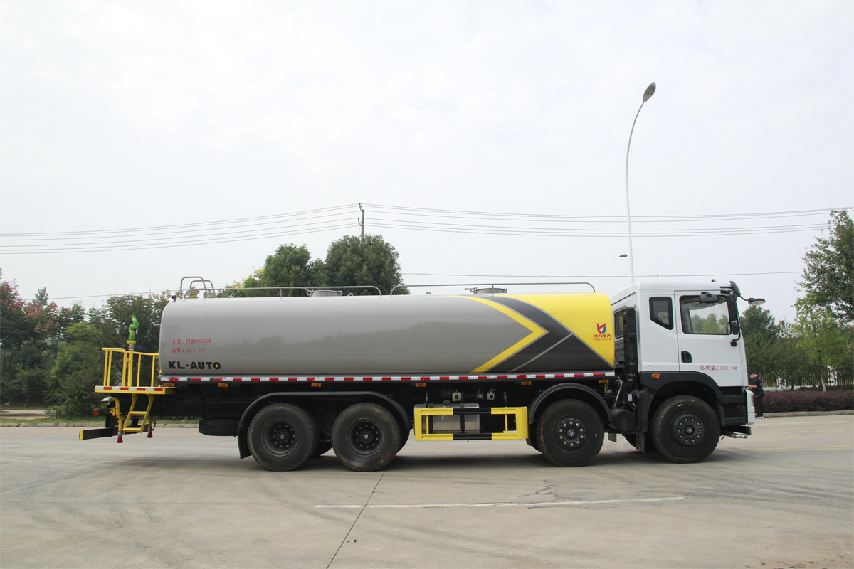 灑水車前裝有鴨形噴嘴或圓頭沖嘴,后面裝有圓柱開灑水噴嘴或蓮蓬頭噴嘴,后部有一工作平臺,裝配有水炮。后部還可裝8個噴嘴(選裝)。